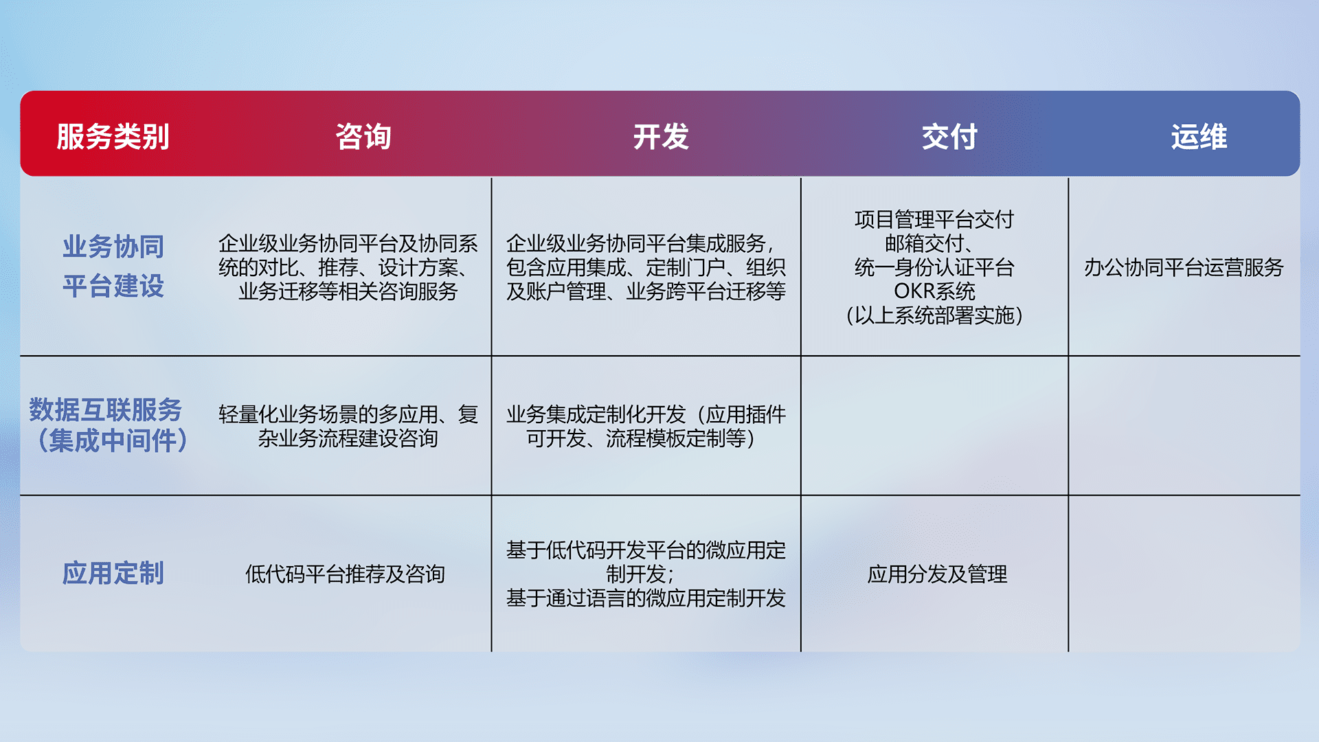 针对钉钉、、企微、、、、IDaas等平台级产品提供产品的规划、、、、方案、、、交付、、、定制化开发等服务,,,实现如统一协同办公、、智能客户服务、、混合会议管理、、智能数据查询、、等业务场景,,,实现数字化转型。。。。